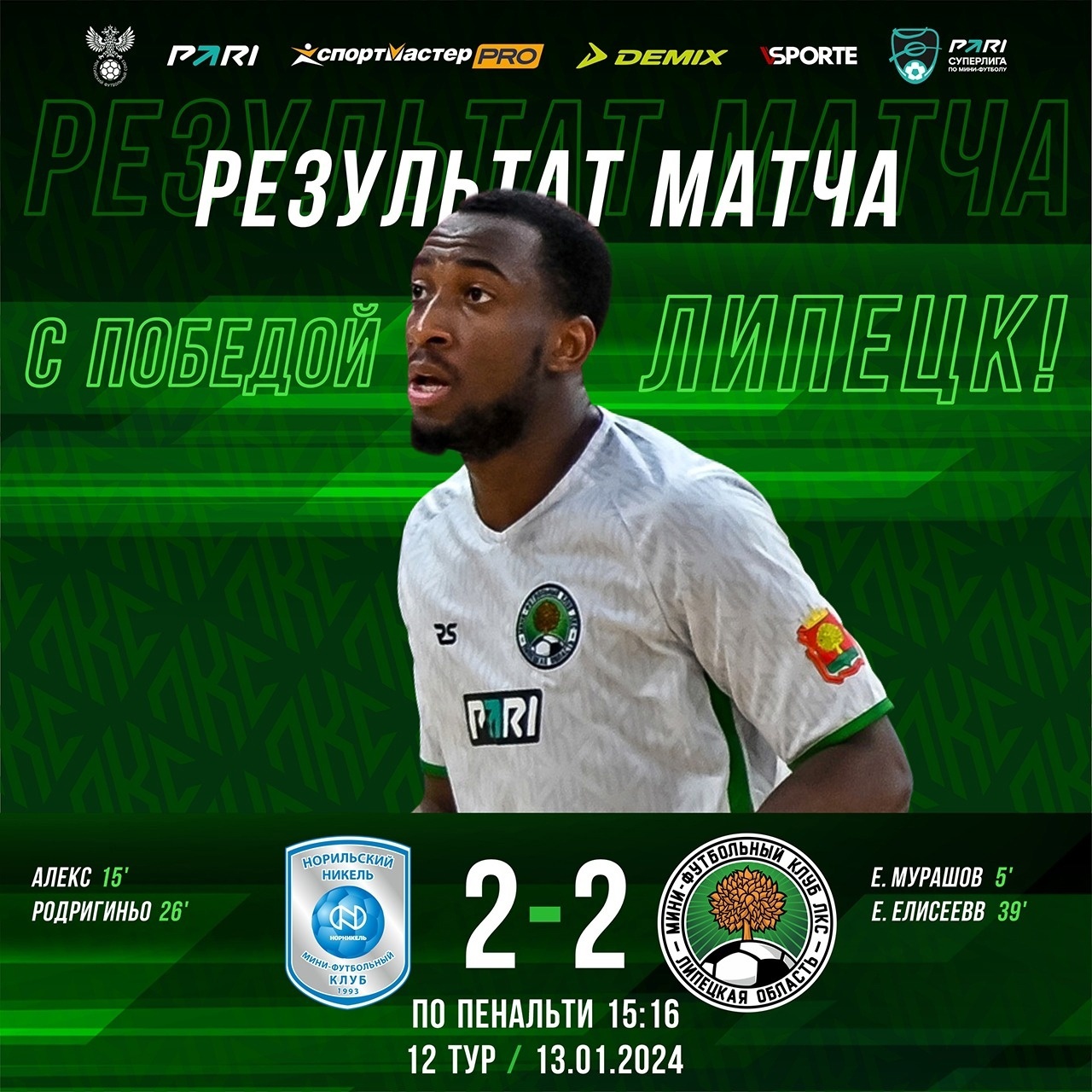 МФК «Норильский никель» (Норильск) – МФК ЛКС (Липецкая область) – 2:2 (1:1), по пенальти 15:16. PARI – Суперлига / Чемпионат России по мини-футболу среди мужских команд / сезон 2023/24, 12 тур, первый матч. 13 января 2024 года. Спорт-холл «Айка» (Норильск, ул. 50 лет Октября, 6). Голы: Евгений Мурашов — 5 мин (0:1), Алекс — 15 мин (1:1), Родригиньо — 26 мин (2:1), Елисей Елисеев — 39 мин (2:2). Серия пенальти: Илья Андреев — 0:1, Руслан Кудзиев — 1:1, Янник Сомплей Джилеру — 1:2, Жулио Занотто — 2:2, Руслан Курбанов — 2:3, Алекс — 3:3, Александр Дунец — 3:4, Нандо — 4:4, Олег Кручинин — 4:4, Данил Давыдов — 4:4, Глеб Подковыров — 4:5, Родригиньо — 5:5, Исмаил Гибадуллин — 5:6, Владимир Саносян — 6:6, Елисей Елисеев — 6:7, Алексей Лялин — 7:7, Евгений Мурашов — 7:8, Ренат Шакиров — 8:8, Фидан Низамутдинов — 8:9, Данил Кутузов — 9:9, Леон Геджуа — 9:10, Александр Костромин — 10:10, Родион Залалетдинов — 10:11, Темирлан Алибеков — 11:11, Павел Копанев — 11:12, Николай Балашов — 12:12, Илья Андреев — 12:12, Владислав Яковлев — 12:12, Александр Дунец — 12:13, Руслан Кудзиев — 13:13, Янник Сомплей Джилеру — 13:14, Жулио Занотто — 14:14, Глеб Подковыров — 14:15, Алекс — 15:15, Олег Кручинин — 15:16, Нандо 15:16. Предупреждения: Нандо / Илья Андреев. Фолы: 1 тайм — 1/2, 2 тайм — 3/2.