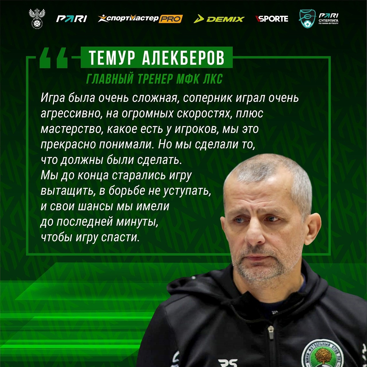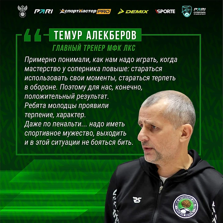 – Игра была очень сложная, соперник играл очень агрессивно, на огромных скоростях, плюс мастерство, какое есть у игроков, мы это прекрасно понимали, – сказал после игры главный тренер ЛКС Темур Алекберов. – Но мы сделали то, что должны были сделать. Мы до конца старались игру вытащить, в борьбе не уступать, и свои шансы мы имели до последней минуты, чтобы игру спасти. Да, сегодня это не случилось. Тем не менее благодарю ребят, потому что видел и характер, и тактически они старались, находили в себе силы цепляться и не отдавать игру. Было легко при счёте 0:3 развалиться, но мы это не сделали. И это очень здорово, это большой плюс для команды, что она при счёте 0:3 верила и старалась игру вытащить.