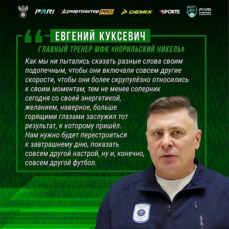 – Нас преследовал с самого начала режим энергосбережения, периодически с которого мы могли включаться, когда забивали голы, повели, создавали моменты, – сказал после матча главный тренер «Норильского никеля» Евгений Куксевич. – Каким образом он нас преследовал, это в завершающей стадии, где нужно было забивать свои моменты, выходить вперёд и не доводить концовку до игры четыре на пять, на тоненького. Конечно, обидно в домашних условиях, при наших болельщиках иметь поражение даже по пенальти. Добавлю, с чем это может быть связано. Предыдущие игры в Тюмени были очень напряжёнными, энергозатратными, очень много было потрачено моральных сил, собранности, концентрации, с которой переключиться не всегда легко, когда перед собой видишь соперника, который находится внизу турнирной таблицы. Как мы ни пытались сказать разные слова своим подопечным, чтобы они включали совсем другие скорости, чтобы они более скрупулёзно относились к своим моментам, тем не менее соперник сегодня со своей энергетикой, желанием, наверное, больше горящими глазами заслужил тот результат, к которому пришёл. Нам нужно будет перестроиться к завтрашнему дню, показать совсем другой настрой, ну и, конечно, совсем другой футбол.