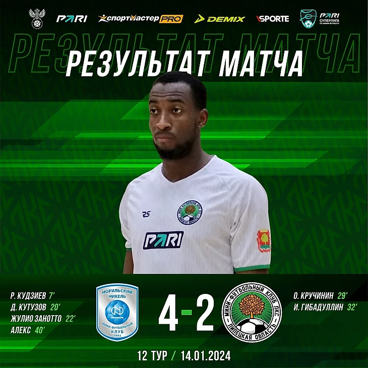 МФК «Норильский никель» (Норильск) – МФК ЛКС (Липецкая область) – 4:2 (2:0). PARI – Суперлига / Чемпионат России по мини-футболу среди мужских команд / сезон 2023/24, 12 тур, второй матч. 14 января 2024 года. Спорт-холл «Айка» (Норильск, ул. 50 лет Октября, 6). Голы: Руслан Кудзиев — 7 мин (1:0), Данил Кутузов — 20 мин (2:0), Жулио Занотто — 22 мин (3:0), Олег Кручинин — 29 мин (3:1), Исмаил Гибадуллин — 32 мин (3:2), Алекс — 40 мин (4:2). Предупреждения: Нандо, Данил Кутузов / Елисей Елисеев. Фолы: 1 тайм — 2/3, 2 тайм — 3/5.