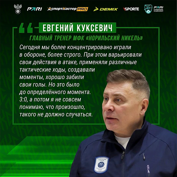 – Сегодня мы более концентрировано играли в обороне, более строго, – отметил после матча главный тренер «Норильского никеля» Евгений Куксевич. – При этом варьировали свои действия в атаке, применяли различные тактические ходы, три – один перестраивались, два – два, создавали моменты, хорошо забили свои голы. Но это было до определённого момента. 3:0, а потом я не совсем понимаю, что произошло, такого не должно случаться. Николай Балашов принял не то решение, не знаю, с чем это связано. Может быть потому, что всё давалось, всё было легко. И вот этот гол дал некоторые эмоциональные силы сопернику, он ринулся вперёд, отыгрываться, ему это удалось. И вот здесь уже висело на волоске, так сказать, интрига создалась. И нам нужно было возвращать полную концентрацию на прежний уровень. В принципе, что и случилось, хотя были нехорошие нотки, когда мы отдавали мяч, присаживались, соперник нагнетал. Хорошо, что мы выдержали. А в концовке четыре на пять мы сыграли сегодня практически безупречно, забили ещё один гол и довели до логического завершения. Молодцы зрители, они всю нас поддерживали, подбадривали даже в сложные моменты. Им большая благодарность. Не за горами следующие игры, мы все их ждём, чтобы наш зал был заполнен, и эта энергетика опять присутствовала. Также благодарю всю команду за непростые матчи. И надо отдать должное сопернику, который дисциплинировано играет, но сегодня наше мастерство было выше.