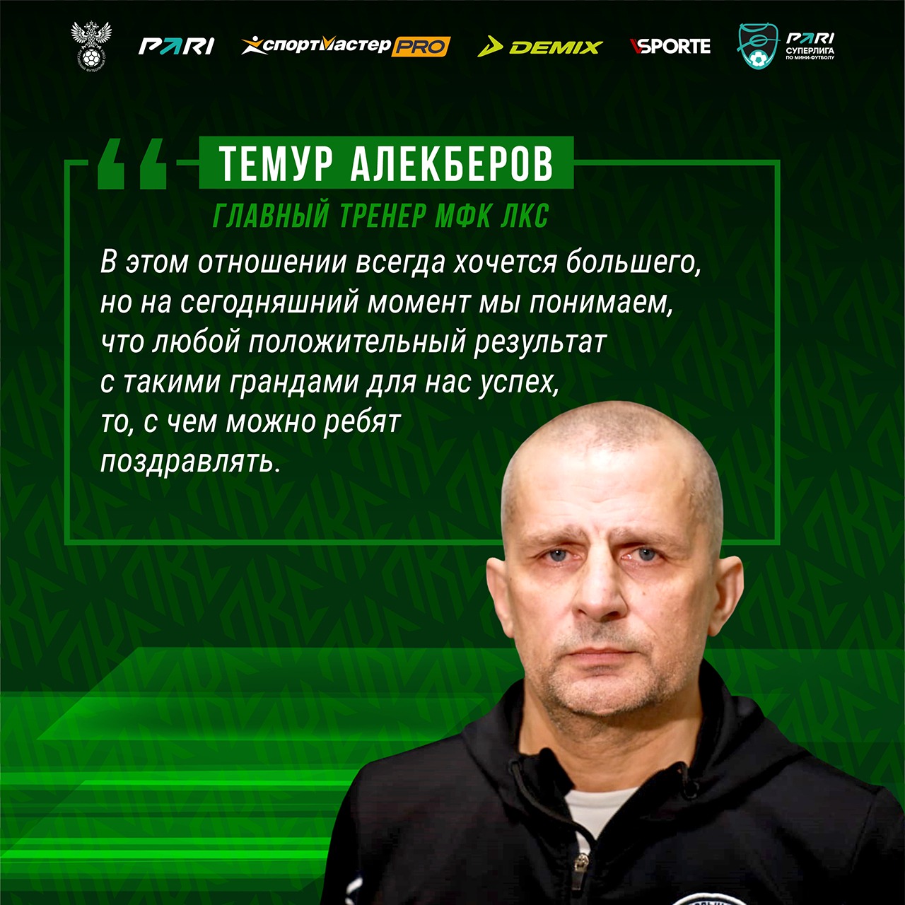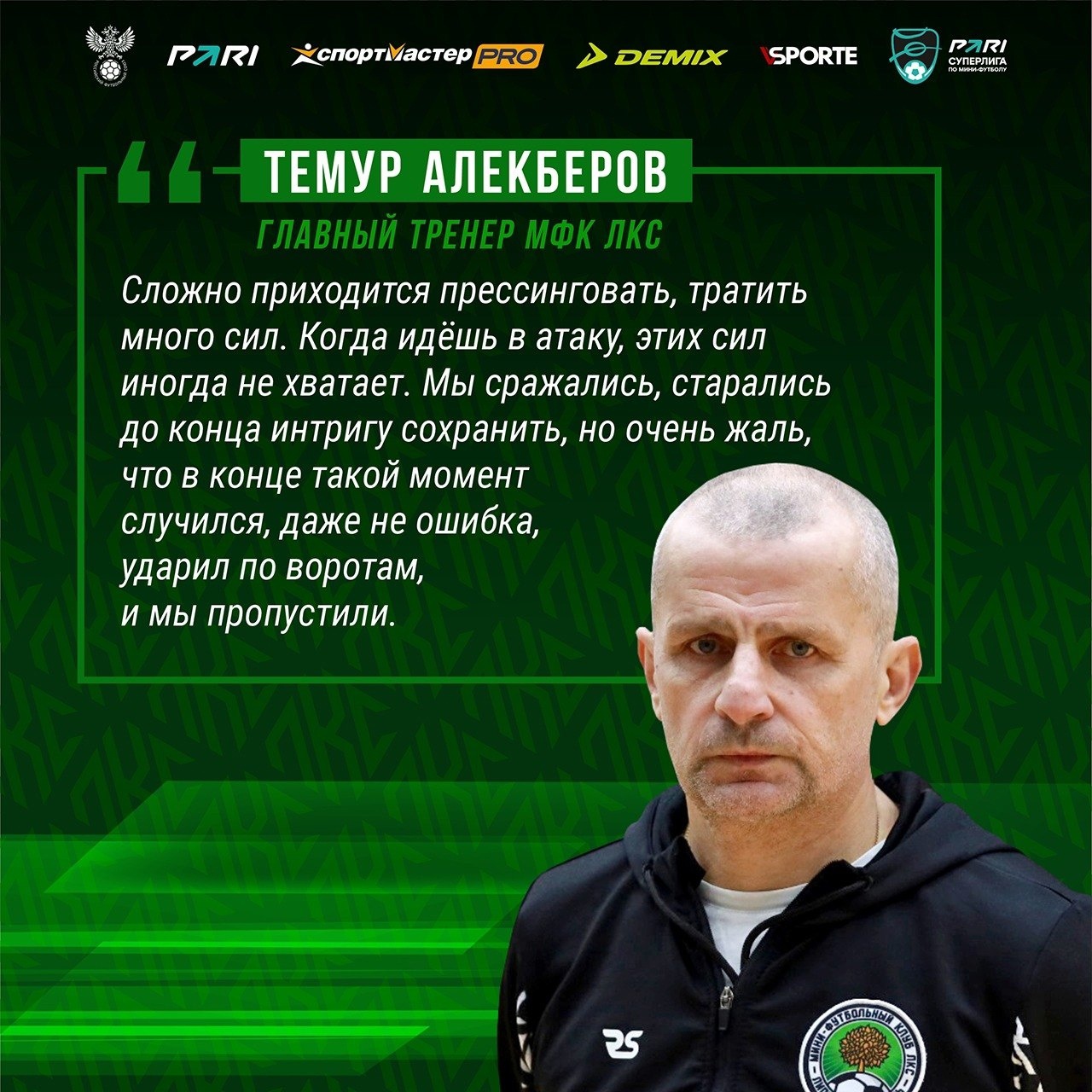 – Это было видно, и перед игрой я говорил, команда соперника, действительно, на хорошем ходу, – прокомментировал игру главный тренер ЛКС Темур Алекберов. – Нельзя предъявлять претензии, что мы чего-то не хотели. Хорошо играли, цепко играли в обороне, очень хорошо прессинговали, в первом тайме нам действительно было сложно. Когда уже начали проигрывать, чуть мы добавили, чуть соперник сбросил обороты. У нас была ситуация, мы подошли с одним мячом, но вот уже второй матч не очень получается игра пять на четыре. Но в целом предъявить претензии по самоотдаче я не могу. Несколько мы ошибались тактически, пропустить третий гол было тактически не грамотно, нельзя было эту ошибку допускать. При счёте 0:2 надо терпеть, ждать своего момента, стараться реализовать всё, что ты создал. Крайне сложно создавать моменты, потому что соперник — мастера, играют очень быстро, чётко. Сложно приходится прессинговать, тратить много сил. Когда идёшь в атаку, этих сил иногда не хватает. Мы сражались, старались до конца интригу сохранить, но очень жаль, что в конце такой момент случился, даже не ошибка, ударил по воротам, и мы пропустили.