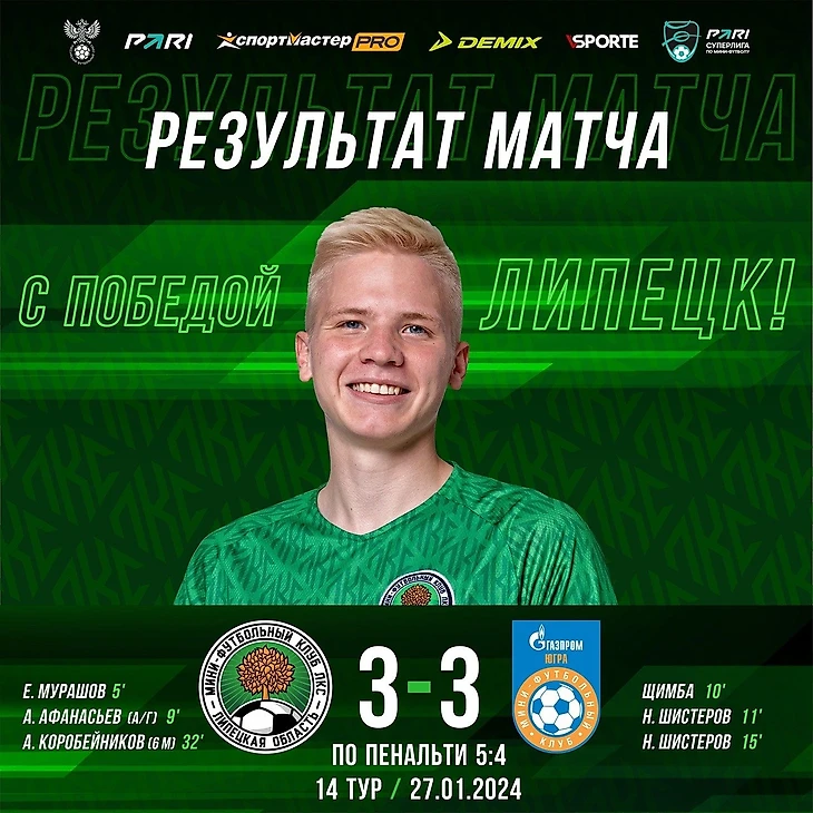 МФК ЛКС (Липецкая область) – МФК «Газпром-Югра» (Югорск) – 3:3 (2:3), по пенальти 5:4. PARI – Суперлига / Чемпионат России по мини-футболу среди мужских команд / сезон 2023/24, 14 тур, второй матч. 27 января 2024 года. УСК «Атлант» (Липецкий район, Копцевы Хутора, ул. Котовского, 1В). Голы: Евгений Мурашов — 5 мин (1:0), Андрей Афанасьев (а/г) — 9 мин (2:0), Щимба — 10 мин (2:1), Николай Шистеров — 11 мин (2:2), Николай Шистеров — 15 мин (2:3), Александр Коробейников (6 м) — 32 мин (3:3). Серия пенальти: Николай Шистеров – 0:1, Денис Гуляйкин – 1:1, Дуду – 1:2, Александр Коробейников – 2:2, Щимба – 2:2, Илья Андреев – 3:2, Андрей Афанасьев – 3:3, Александр Дунец – 4:3, Андрей Понкратов – 4:4, Александр Серёгин – 5:4. Предупреждения: Денис Гуляйкин / Щимба, Андрей Понкратов. Фолы: 1 тайм — 5/4, 2 тайм — 3/4.