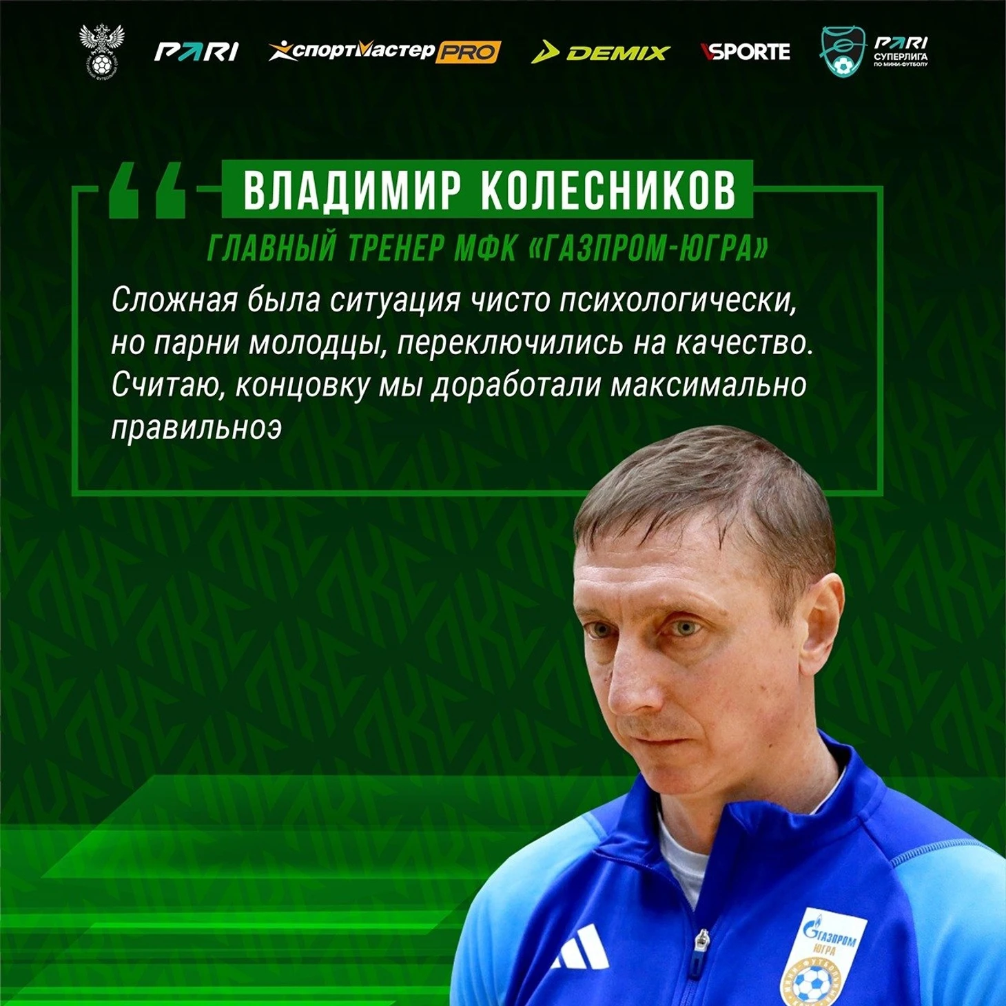 – В первом тайме мы контролировали ход игры, создали достаточно моментов, чтобы увеличить преимущество, – сказал после матча наставник «Газпром-Югры» Владимир Колесников. – Во втором тайме просели, не хватало активности, прежде всего без мяча, выходы в отбор не получались, просаживались слишком низко. Просили ребят, чтобы в этом плане повыше играли. Но это заслуга Липецка, что нам пришлось вторым номером играть. Забили нужный третий мяч в контратаке, но, к сожалению, не хватило нам организованности, второй мяч мы пропустили со стандарта, не ту линию закрыли. Потом перестроились, сложная была ситуация чисто психологически, но парни молодцы, переключились на качество. Считаю, концовку мы доработали максимально правильно.