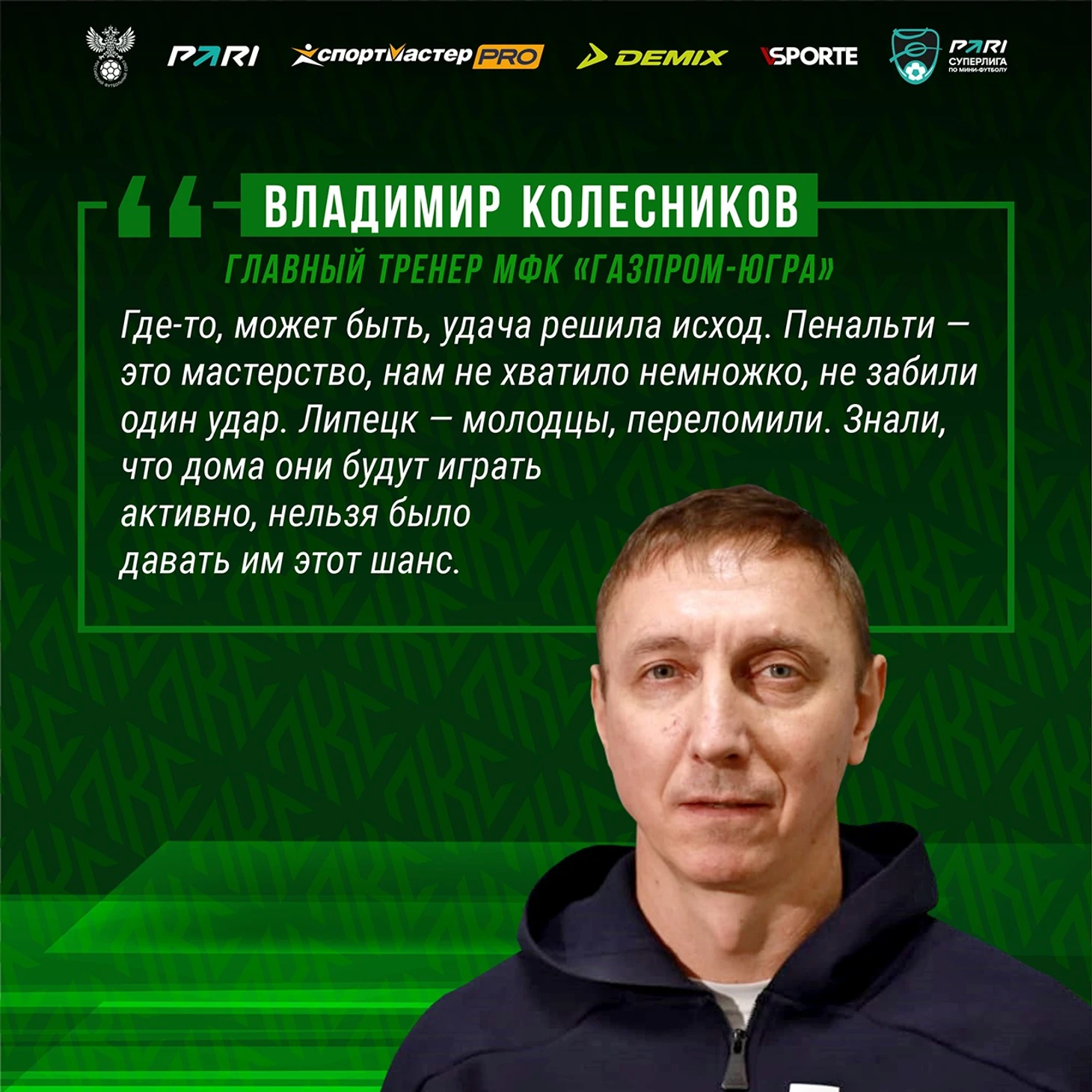– Плохо зашли в игру, пропустили два мяча. Потом получилось организовать, стали появляться моменты, стали забивать, вышли вперёд. Хороший первый тайм. Не хватило баланса в четвёрках, одна работала на результат, вторая немного просела у нас в подготовительной части, не всегда получалось доставлять мяч на столба, включения, плохо работали с мячом. Во втором тайме стали по счёту играть больше. В итоге переиграли смену, не хватило свежести и сделали пенальти, с которого Липецк сравнял счёт. Потом встрепенулись, забрали мяч, стали создавать моменты, но, к сожалению, не хватило нам точности. Если не ошибаюсь, там три штанги было. Где-то, может быть, удача решила исход. Пенальти — это мастерство, нам не хватило немножко, не забили один удар. Липецк — молодцы, переломили. Знали, что дома они будут играть активно, нельзя было давать им этот шанс. Пропускаем мяч, соперник включается, нам этого давления на получилось удержать. Всё равно ребята молодцы, не хватило свежести в концовке. Липецк с победой. Двигаемся дальше.