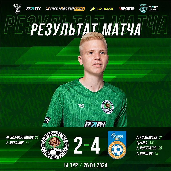 МФК ЛКС (Липецкая область) – МФК «Газпром-Югра» (Югорск) – 2:4 (0:2). PARI – Суперлига / Чемпионат России по мини-футболу среди мужских команд / сезон 2023/24, 14 тур, первый матч. 26 января 2024 года. УСК «Атлант» (Липецкий район, Копцевы Хутора, ул. Котовского, 1В). Голы: Андрей Афанасьев — 3 мин (0:1), Щимба — 10 мин (0:2), Андрей Понкратов — 29 мин (0:3), Фидан Низамутдинов — 31 мин (1:3), Евгений Мурашов — 32 мин (2:3), Александр Пирогов — 38 мин (2:4). Предупреждения: Илья Андреев, Александр Коробейников. Фолы: 1 тайм — 3/4, 2 тайм — 5/3.