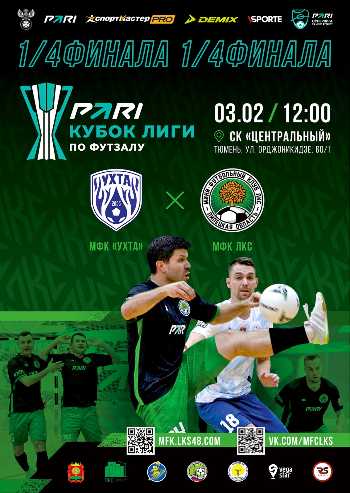 На этой неделе мини-футбольный клуб ЛКС примет участие в розыгрыше PARI – Кубка лиги по футзалу, который пройдёт в Тюмени 3-6 февраля. В 1/4 финала соперником липчан станет лидер Суперлиги – МФК «Ухта». Матч состоится 3 февраля (суббота) в СК «Центральный» (Тюмень, ул. Орджоникидзе, 60/1). Начало – 12:00 (мск).