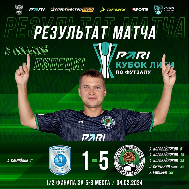 МФК «Норильский никель» (Норильск) – МФК ЛКС (Липецкая область) – 1:5 (1:2) PARI – Кубок лиги по футзалу 2024, 1/2 финала за 5-8 места. 4 февраля 2024 года. СК «Центральный» (Тюмень, ул. Орджоникидзе, 60/1). Голы: Александр Коробейников — 5 мин (0:1), Александр Самойлов — 7 мин (1:1), Александр Коробейников — 18 мин (1:2), Александр Коробейников — 34 мин (1:3), Олег Кручинин (10 м) — 36 мин (1:4), Елисей Елисеев — 38 мин (1:5). Предупреждения: Янник Сомплей Джилеру, Глеб Подковыров. Удаление: Янник Сомплей Джилеру — 18 мин. Фолы: 1 тайм — 2/2, 2 тайм — 6/5.
