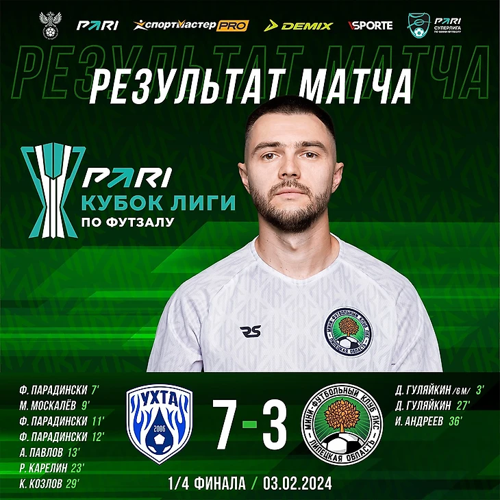 МФК «Ухта» (Ухта) – МФК ЛКС (Липецкая область) – 7:3 (5:1). PARI – Кубок лиги по футзалу 2024, 1/4 финала. 3 февраля 2024 года. СК «Центральный» (Тюмень, ул. Орджоникидзе, 60/1). Голы: Денис Гуляйкин (6 м) — 3 мин (0:1), Фелипе Парадински — 7 мин (1:1), Михаил Москалёв — 9 мин (2:1), Фелипе Парадински — 11 мин (3:1), Фелипе Парадински — 12 мин (4:1), Андрей Павлов — 13 мин (5:1), Роман Карелин — 23 мин (6:1), Денис Гуляйкин — 27 мин (6:2), Кирилл Козлов — 29 мин (7:2), Илья Андреев — 36 мин (7:3). Предупреждения: Кирилл Козлов, Максим Перевалов, Рафаэл Бруно. Фолы: 1 тайм — 4/4, 2 тайм — 5/5.