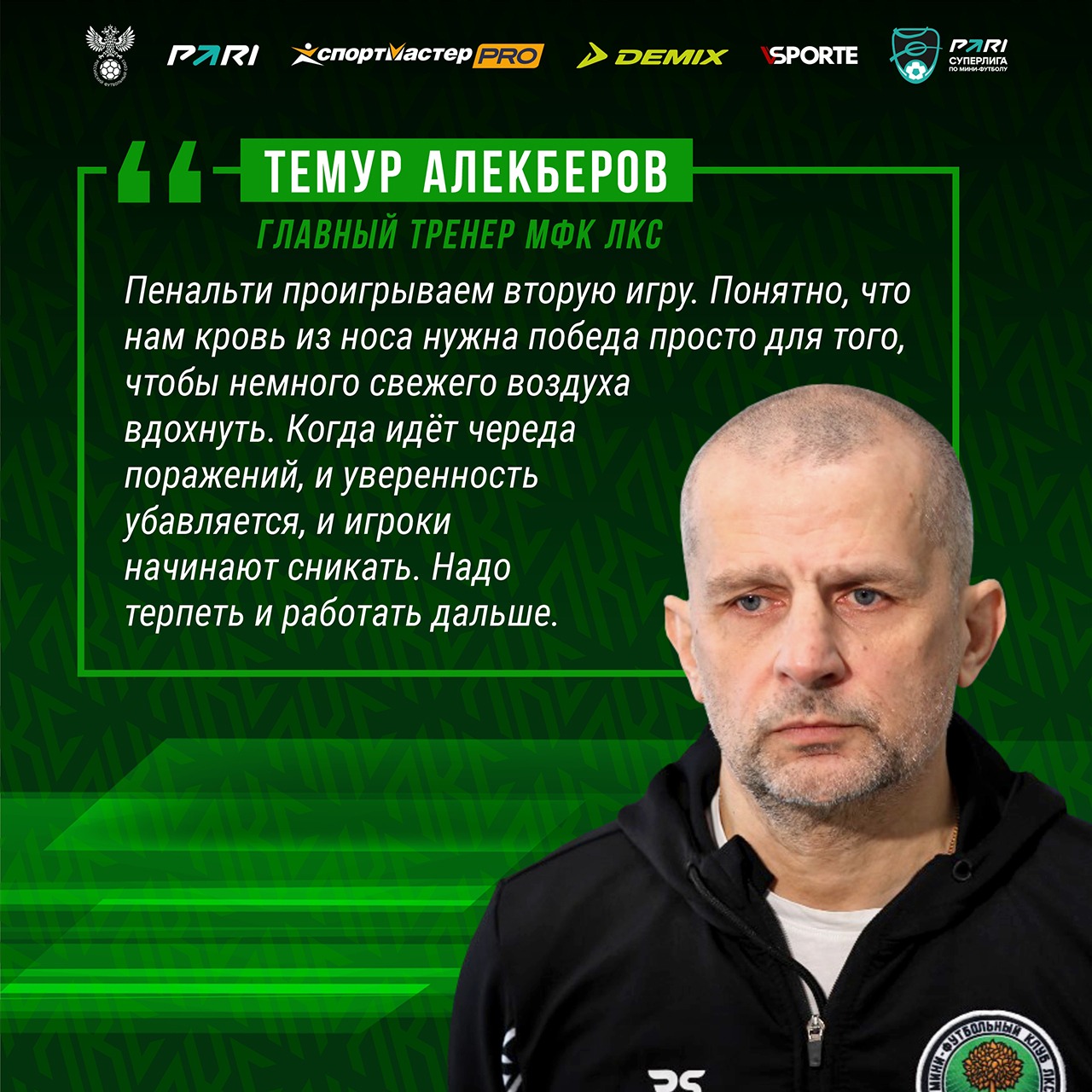 – Мы очень плохо бьём пенальти, – прокомментировал результат главный тренер ЛКС Темур Алекберов. – Несколько раз говорилось, что бить надо на силу, тут не надо бить на технику. Посмотрите, как нам бьют, просто разбегаются и бьют. Мы же начинаем что-то выдумывать. Пенальти проигрываем вторую игру. Понятно, что нам кровь из носа нужна победа просто для того, чтобы немного свежего воздуха вдохнуть. Когда идёт череда поражений, и уверенность убавляется, и игроки начинают сникать. Поэтому очень трудно вдохновлять, очень трудно мотивировать. Нужна эта победа, но пока мы получаем поражения. Надо терпеть и работать дальше.