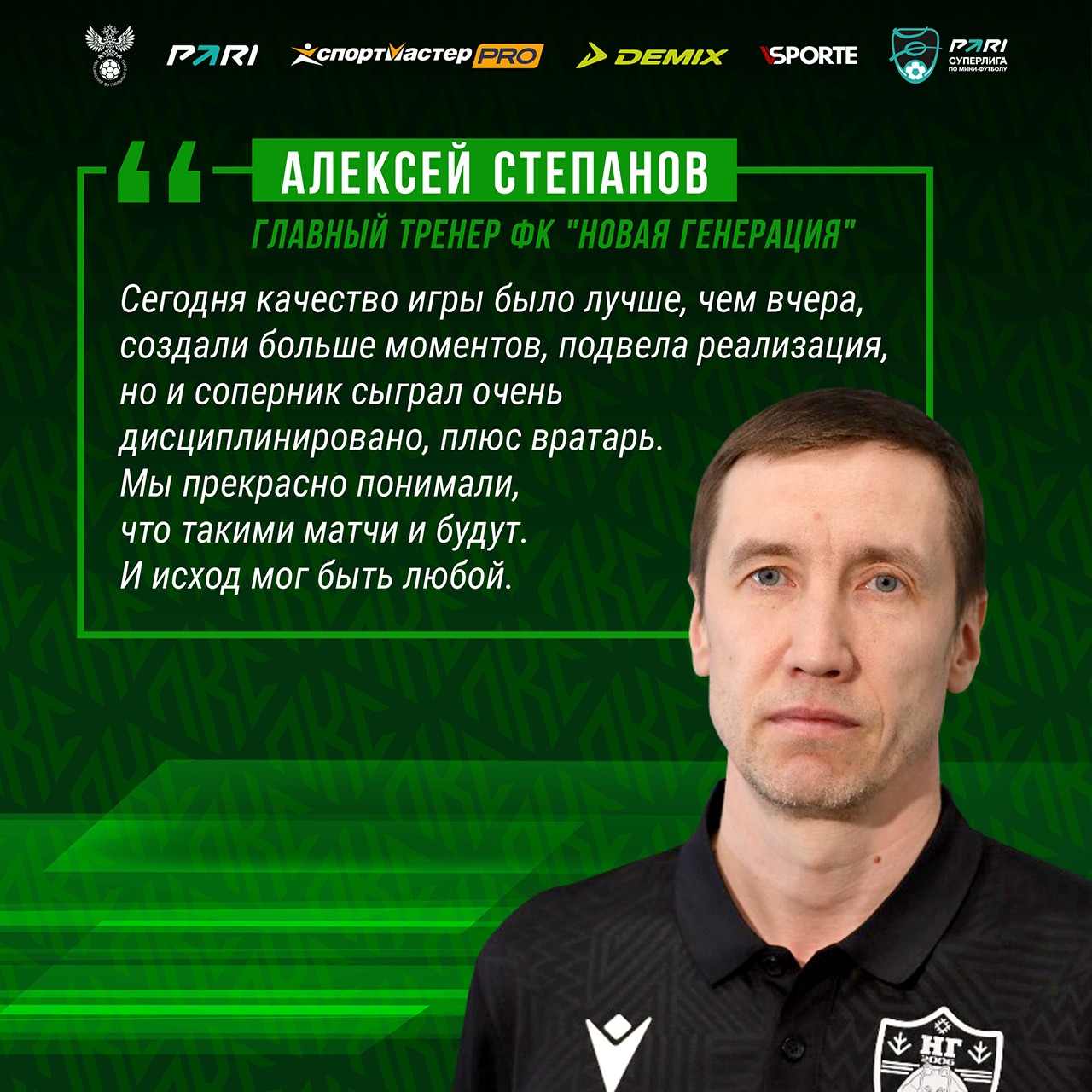– Хорошо разыграли пятого полевого игрока, – отметил после матча главный тренер «Новой генерации» Алексей Степанов. – Сыграли три передачи в касание, что и вылилось в гол. Когда идёт игра в касание, очень сложно перекрыть. Гол получился красивый, качественный, за счёт этого мы и перевели игру в серию пенальти. Мы прямые конкуренты, каждое очко на вес золота. Радует, что в тяжёлых моментах, когда мы проигрываем, не теряемся, продолжаем создавать моменты. Сегодня качество игры было лучше, чем вчера, больше моментов было, подвела реализация, но и соперник сыграл очень дисциплинировано, плюс вратарь. Мы прекрасно понимали, что такими матчи и будут. И исход мог быть любой. Мы довольны результатом, спасибо ребятам за самоотдачу. Ну и Булат, конечно, наша палочка-выручалочка.