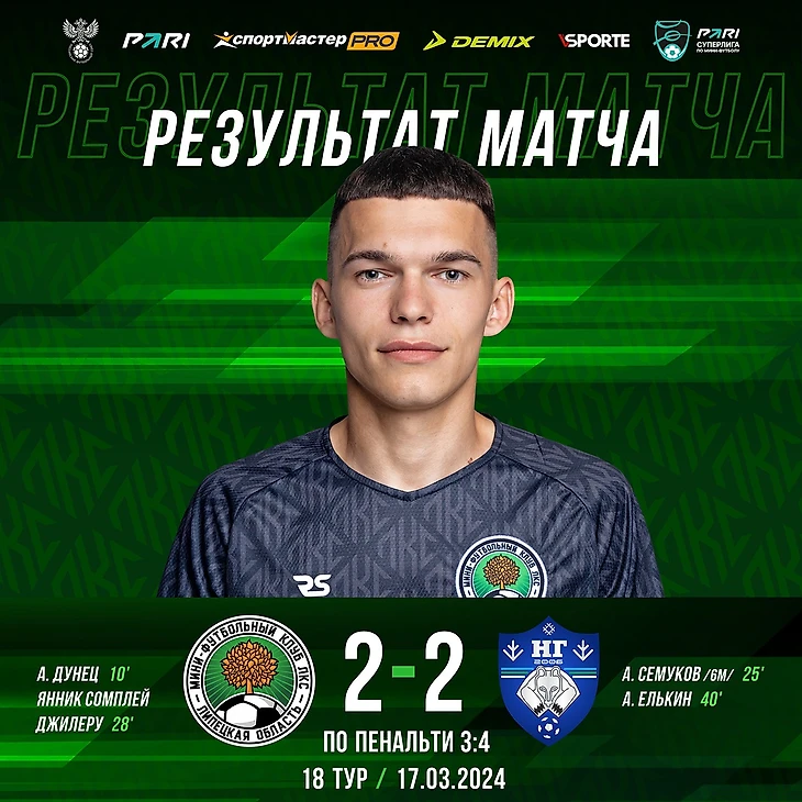 Во втором матче 18-го тура PARI – Суперлиги между ЛКС и «Новой генерацией» не принимал участие голкипер липчан Родион Залалетдинов, который только приступил к тренировкам после повреждения, а у гостей перебрал жёлтых карточек и пропускал игру Тимофей Турчин. В первые минуты у ворот липчан было жарко, гости создали несколько острых моментов. На 5-й минуте ЛКС ответил опасным ударом Александра Коробейникова, похожим образом он забил накануне, но на этот раз Александр Кригер с ударом справился. А уже в следующей атаке свои лучшие качества проявил Леон Геджуа, отразив два опаснейших удара игроков гостей, а потом ещё и успевший снять мяч с головы Даниила Ковтуна. На 10-й минуте гости заработали опасный штрафной, но не смогли его реализовать, тут же Геджуа забросил мяч через всю площадку, и Александр Дунец буквально затолкал мяч в сетку ворот Кригера. Липчане провели ещё несколько неплохих атак. На 16-й минуте «Новая генерация» чудом не сравняла счёт, Александр Дунец на линии ворот грудью отразил удар Даниила Ильина. В концовке тайма страсти немного накалились, но вылились в эмоции игроков, а не в забитые мячи. Отметим, что в первом тайме у липчан получили предупреждения Александр Коробейников и Янник, которые пропустят следующий матч из-за перебора жёлтых карточек.