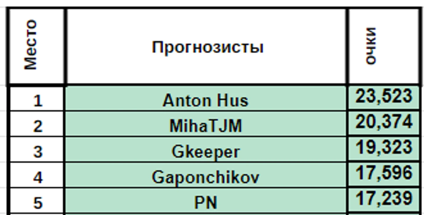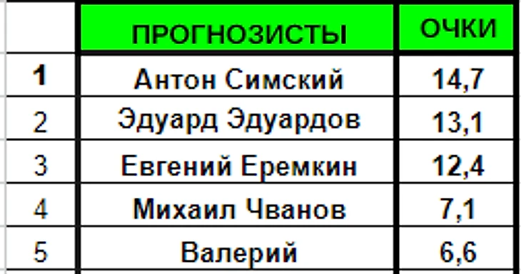 Напомню, что Power прогноз основан на букмекерских коэффициентах. Игрокам нужно было верно распределить 10 условных баллов на исходы 8 матчей. И лучше всех с задачей справился Антон Симский. Второе место у Эдуарда Эдуардова, третий Евгений Еремкин.