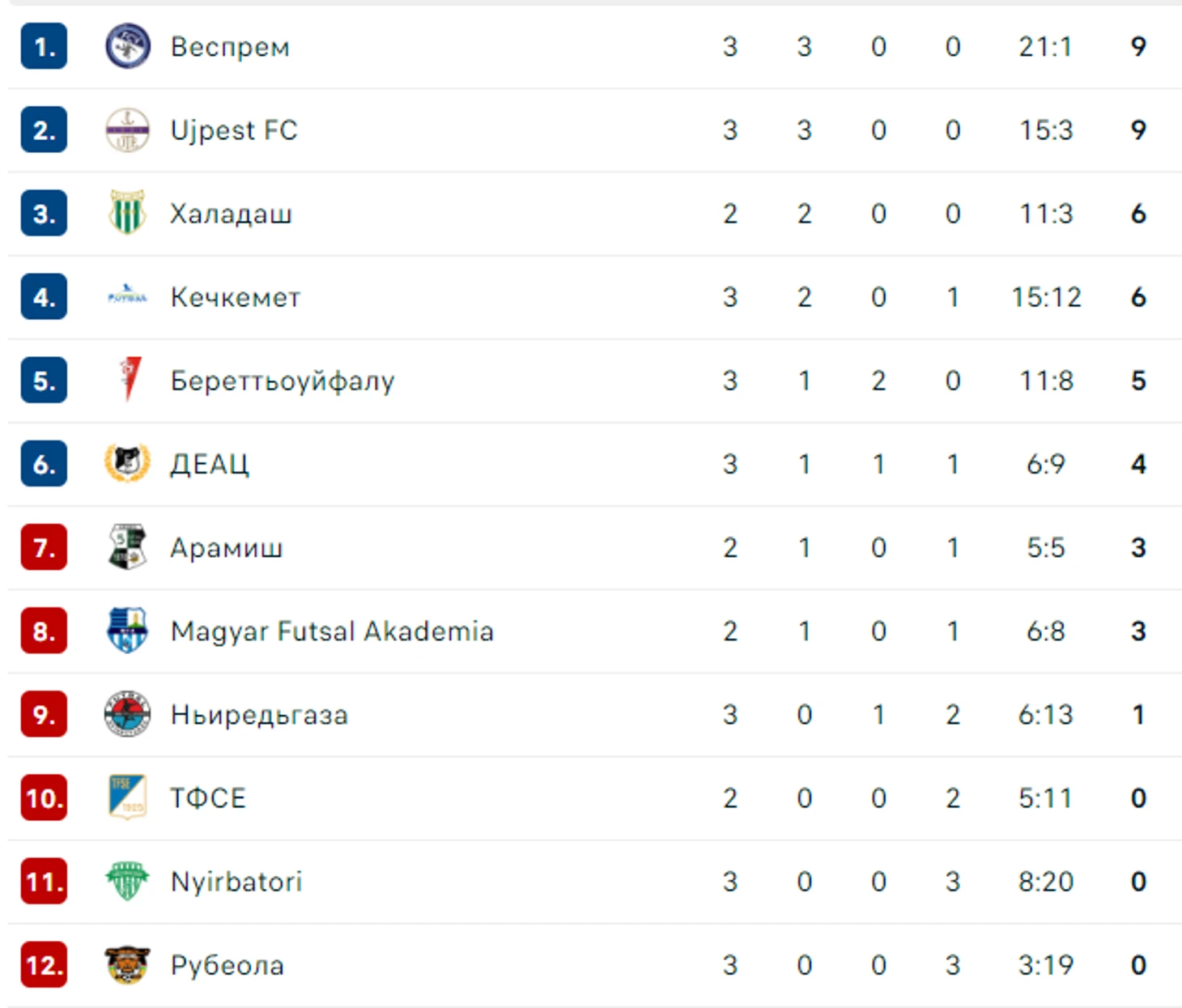В Венгрии уже во всю играют. Но прямо в минувшем туре суперинтриг не было. Любопытным казалось закинет ли десяточку «Веспрем» в ворота «Рубеола». Первые лидировали в чемпионате, а вторые жестко валились и шли на последнем месте. «Веспрем» громил тех, от кого «Рубеола» жестко отлетала. Но всё обошлось – всего-то 8:1.
