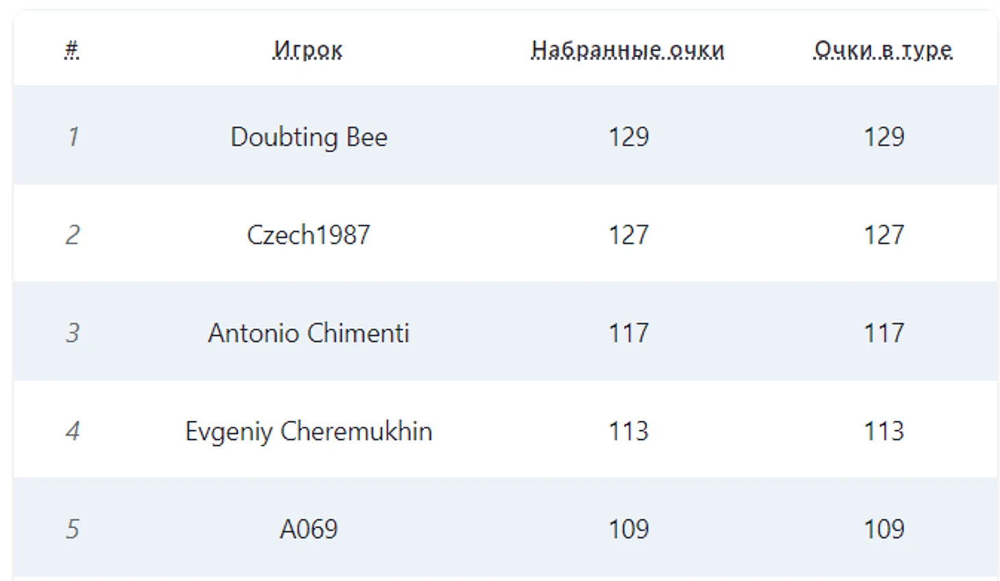 В fantasy-турнире на вершину забрался Doubting Bee. Его догоняют Czech1987 и Antonio Chimenti. Здесь отыграться ещё тяжелее. Но можно попробовать. По крайней мере, если вы не играли в фэнтези – стоит заценить, это круто.
