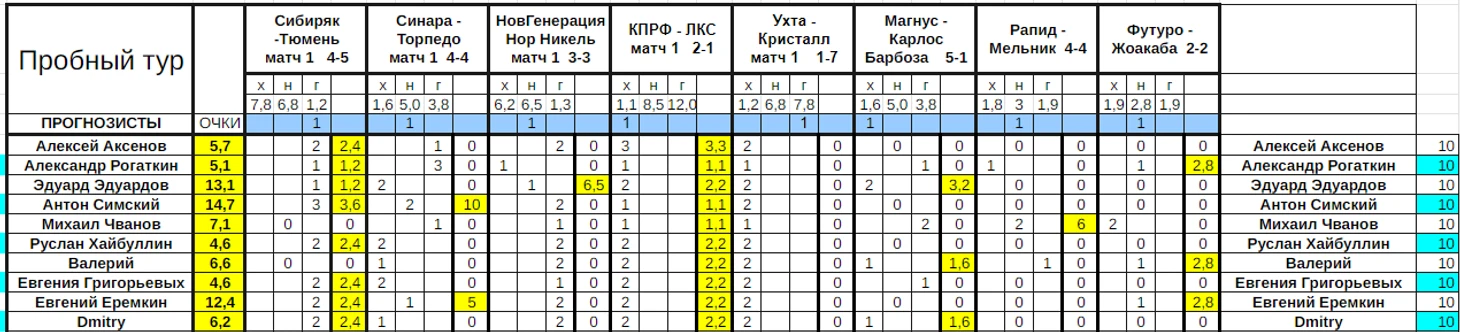 В классических прогнозах лидирует Anton Hus, блестяще угадавший три ничейных исхода. В том числе оба матча «Новой генерации» и «Норильского никеля».