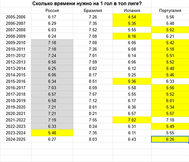 Если смотреть в комплексе, российская суперлига занимает третье место по среднему времени на гол, уверенно опережая Бразилию. В России в среднем 6:00-6:30 минут нужно для гола, исключение составляют период адаптации к нововведениям и кризисные годы.