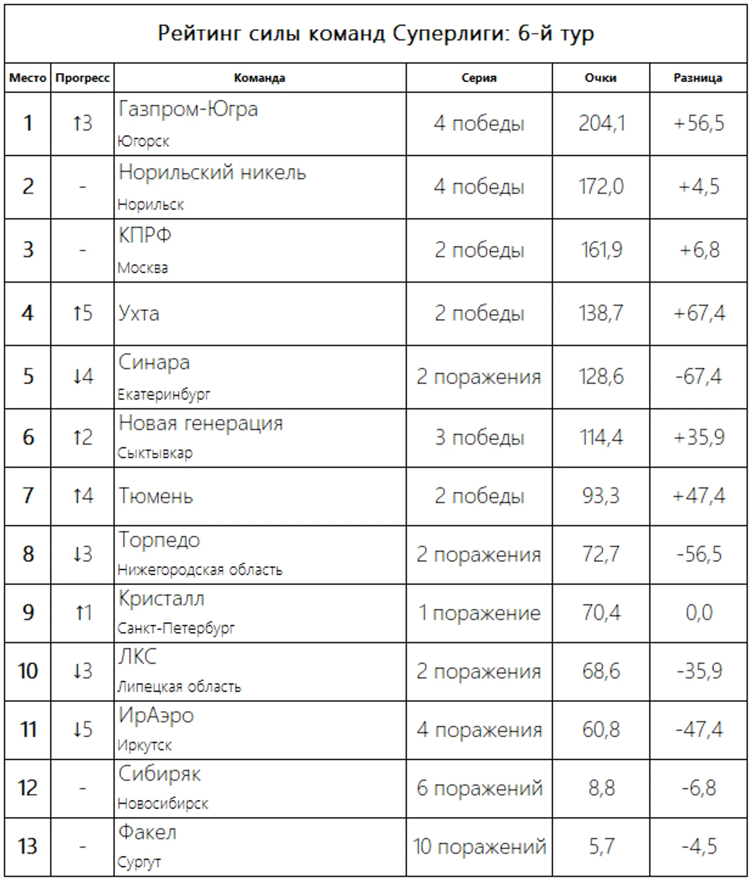Богатый урожай баллов индекса силы по итогам тура собрали также «Тюмень» и «Новая генерация», подобравшись к топ-5. «ИрАэро» после двух домашних поражений скатился на 5 мест и теперь не попадает даже в десятку. А полный Рейтинг силы после 6-го тура выглядит так.