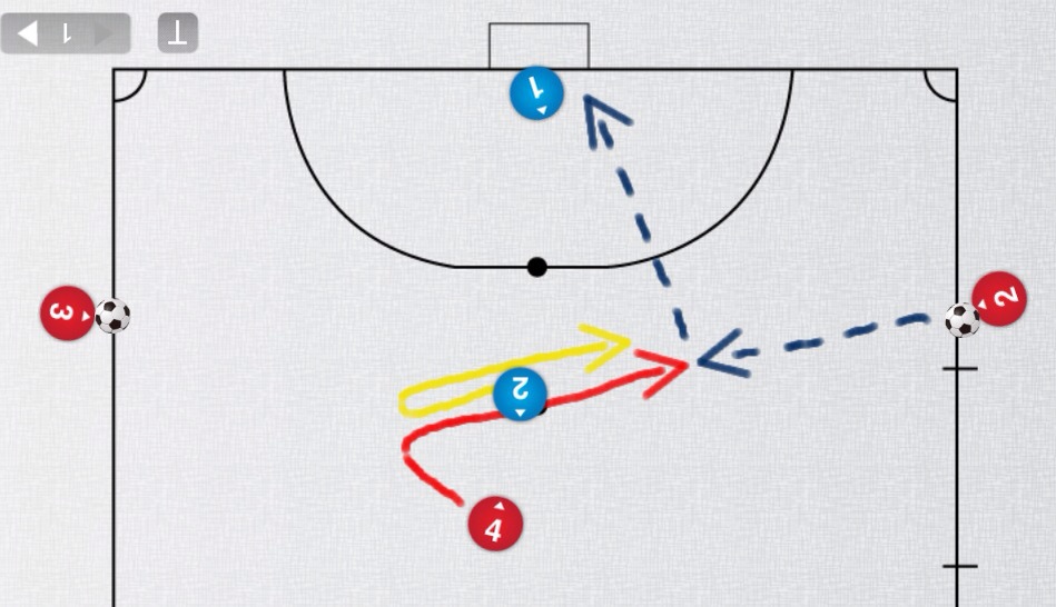 Форвард находится примерно в 12 метрах от ворот. Защитник рядом. Задача упражнения в том, что форвард обманными движениями должен освободится от опеки защитника и выйдя на свободное место получить мяч и пробить по воротам. Форвард может получить мяч от любого партнера, находящегося на боковой линии.