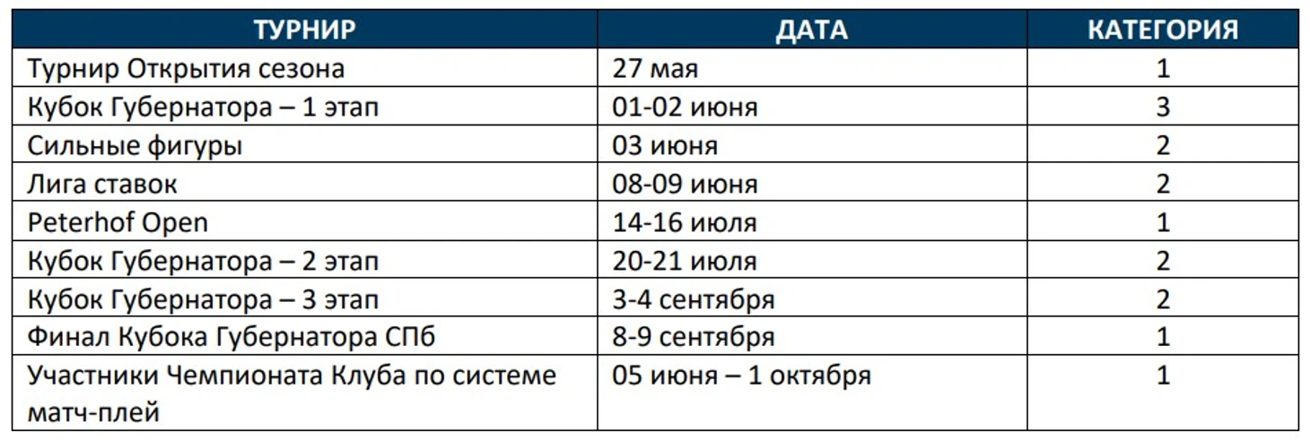 С этого сезона мы вводим рейтинговую систему проведения турниров в гольф-клубе «Петергоф». В рейтинг войдут следующие соревнования: