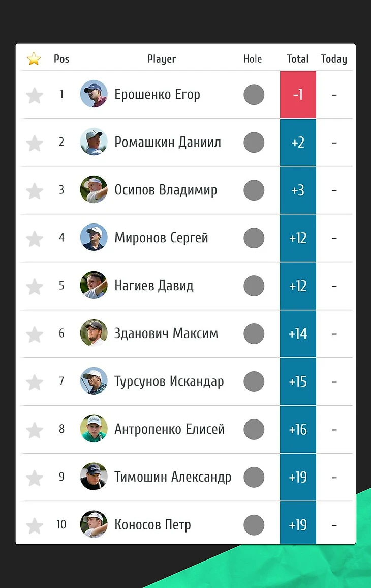 Первый игровой день Даниил завершил на второй строчке. Он прошел поле за 72 удара (в пар) с двумя богги и двумя берди. От первого места Ромашкин отставал на два удара.