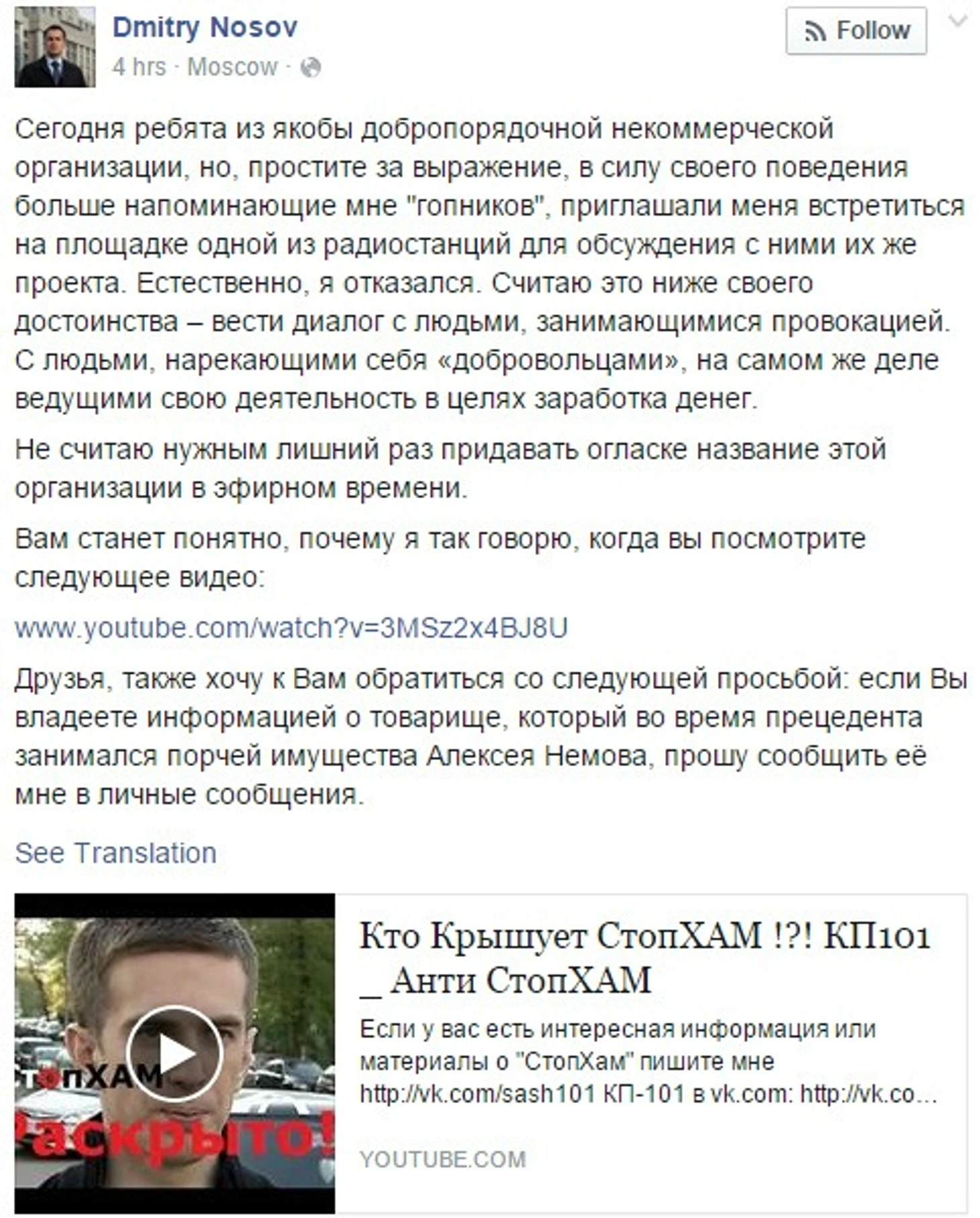 Друзья, также хочу к вам обратиться со следующей просьбой: если вы владеете информацией о товарище, который во время прецедента занимался порчей имущества Алексея Немова, прошу сообщить ее мне в личные сообщения», – написал Носов.