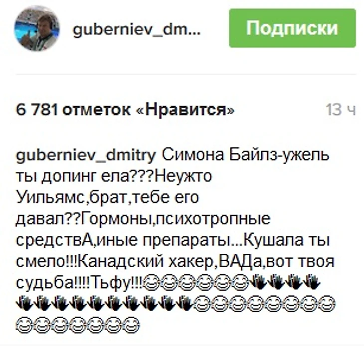 Известный спортивный телекомментатор Дмитрий Губерниев прокомментировал информацию о том, что спортивная гимнастка из США Симоне Байлс употребляла запрещенные препараты.