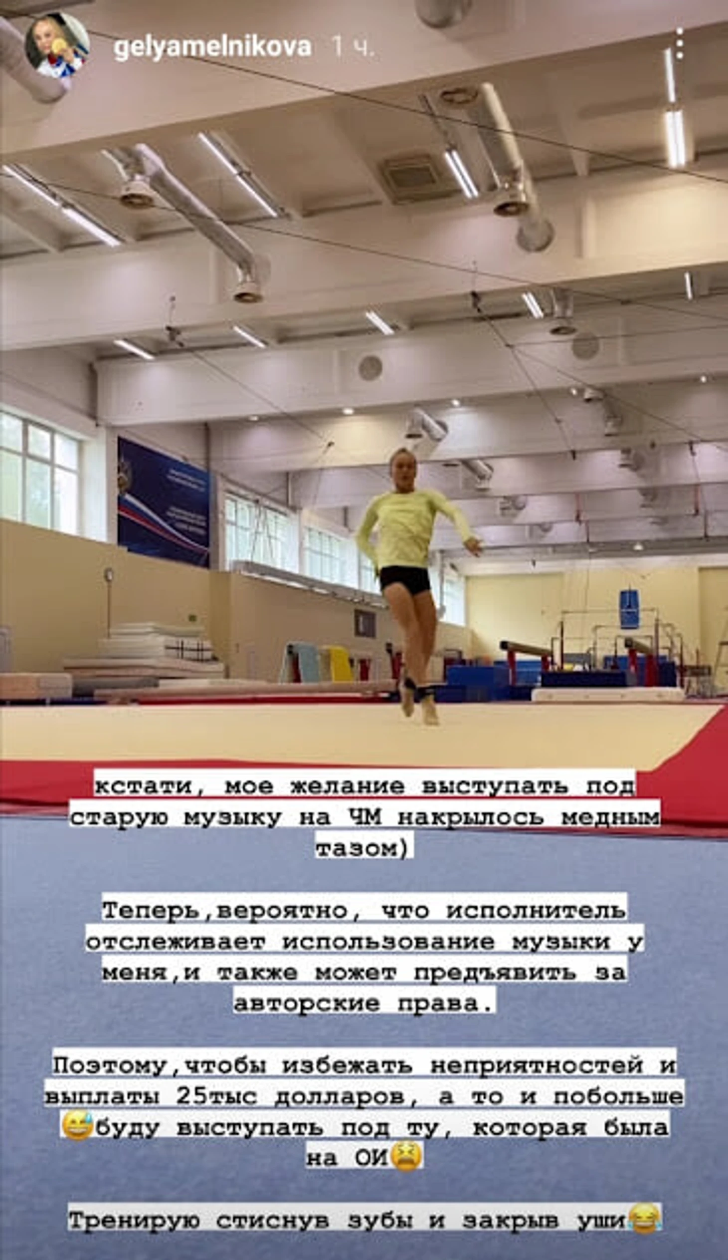«Кстати, мое желание выступать под старую музыку на ЧМ накрылось медным тазом. Теперь вероятно, что исполнитель отслеживает использование музыки у меня и так же может предъявить за авторские права.