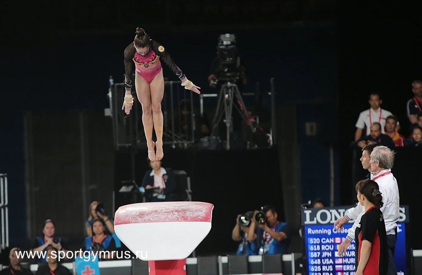 Сильнейшая группа, в которой пятеро претенденток на золото, начинает с опорного прыжка. Четверо прыгают два винта (D=5.4), Ерёмина не рискнула, и прыгнула 1.5 винта (D=5.0). К Элизабет Блэк судьи явно благосклонны. Если ей ставят 14.6, то Муракми надо бы на 0.15-0.2 болше, но японке выставляют только 14.666. Хёрд прыгает намного хуже Муракми и Блэк, но её «подравнивают» с лидерами – 14.533. Лена прыгает намного лучше, чем в квалификации, приземляется в доскок, но ноги в воздухе согнуты, грязновато. Всего 13.866/5.0.