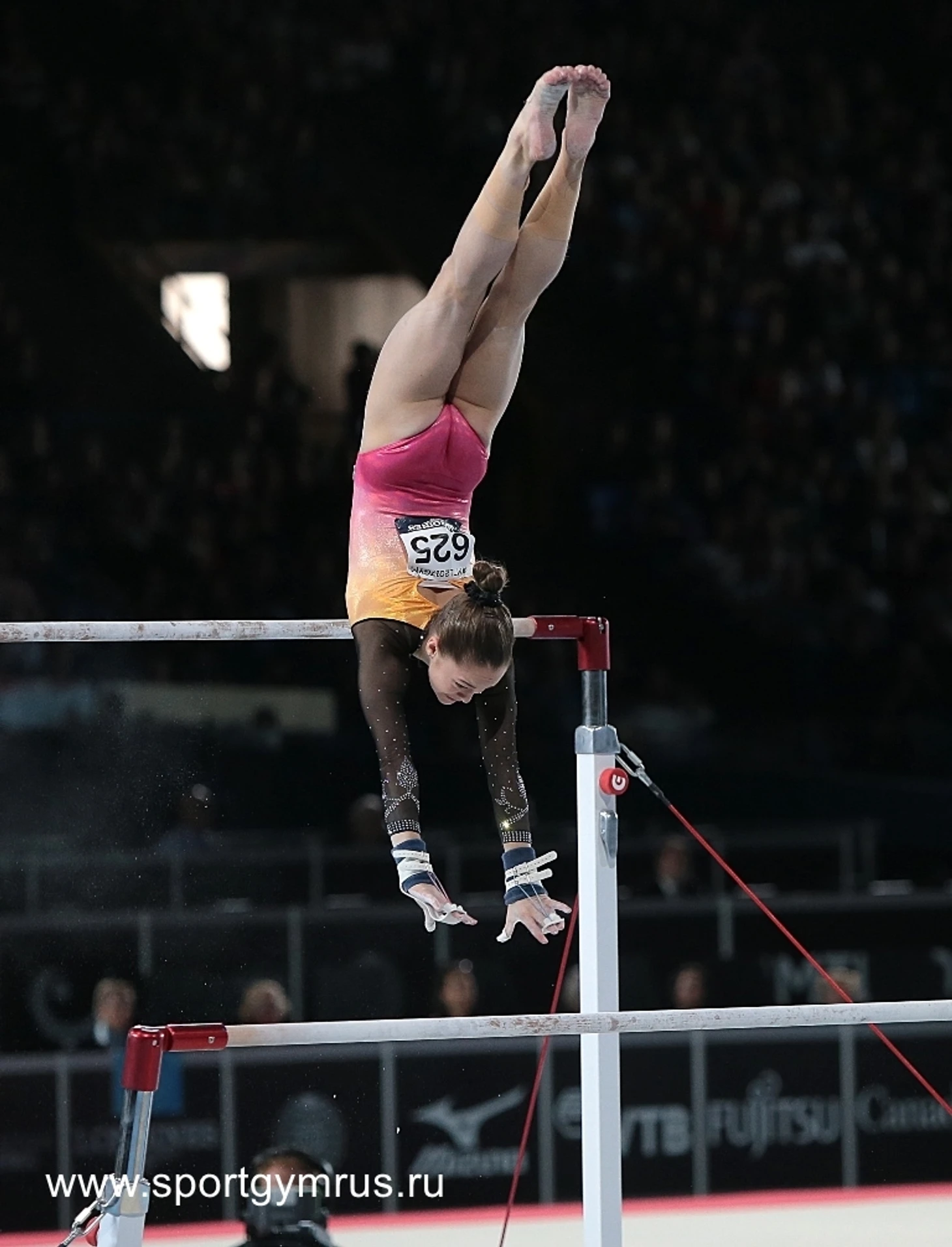 Елена Ерёмина. Всё отлично, и нелепая ошибка на стойке на нижней жерди… Застряла, согнула ноги. А дальше все элементы, связки, соскок – очень хорошо. Но ошибка обошлась примерно в один балл – с учетом незасчитанного элемента: 14.200/6.1. Вот так доля секунды лишила Лену надежды на медаль.