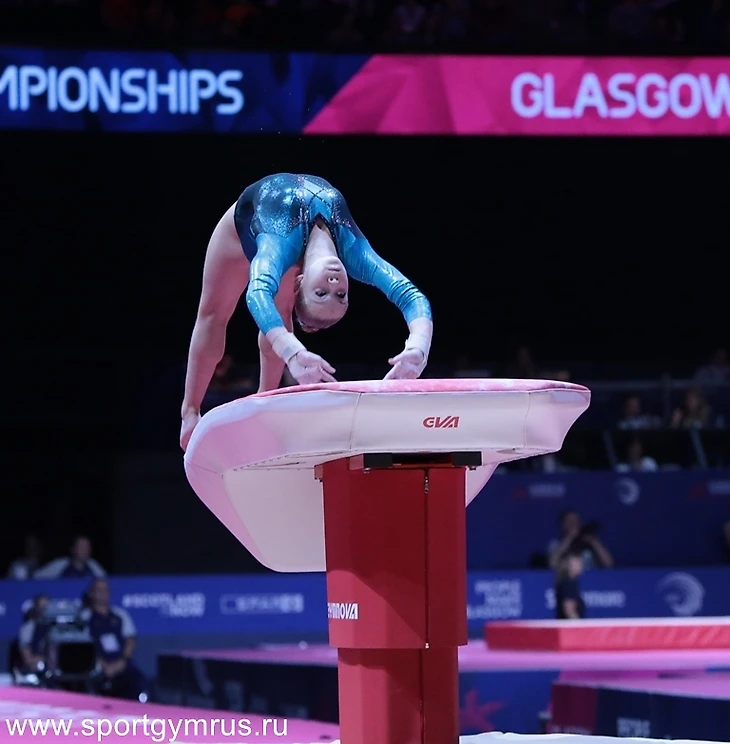 Лилия Ахаимова приехала в Глазго на вольные. Это её коронный снаряд. Но перестаралась – вылет за ковер, грубейшие ошибки и всего 11.733/5.4. Сама не понимает, что произошло.