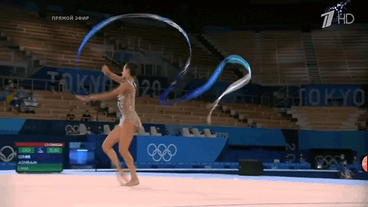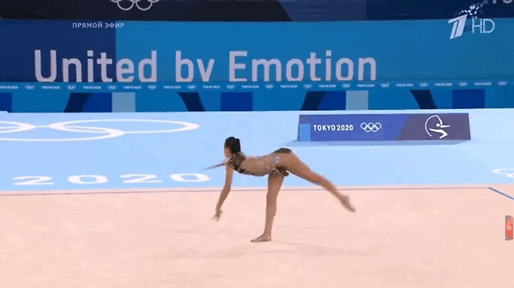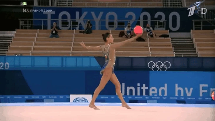 Дина в каждом виде делает вращение на 180° в боковом шпагате с наклоненным корпусом за 0.5. В упражнении с мячом она делает второе вращение аттитюд за 0.7