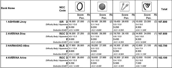 Как видно из таблицы, Линой выиграла за счет трудности тела. За исполнение Дине ставили выше.