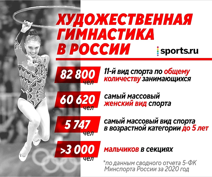 Теперь художка – главный женский вид в России. И это не просто ощущения: по данным Минспорта, в 2020 году художественная гимнастика была самой массовой женской дисциплиной в стране – ею занимались 60 тысяч девчонок разного возраста.