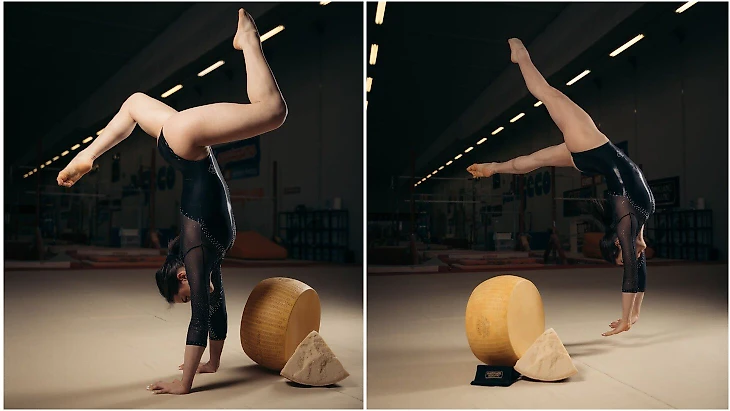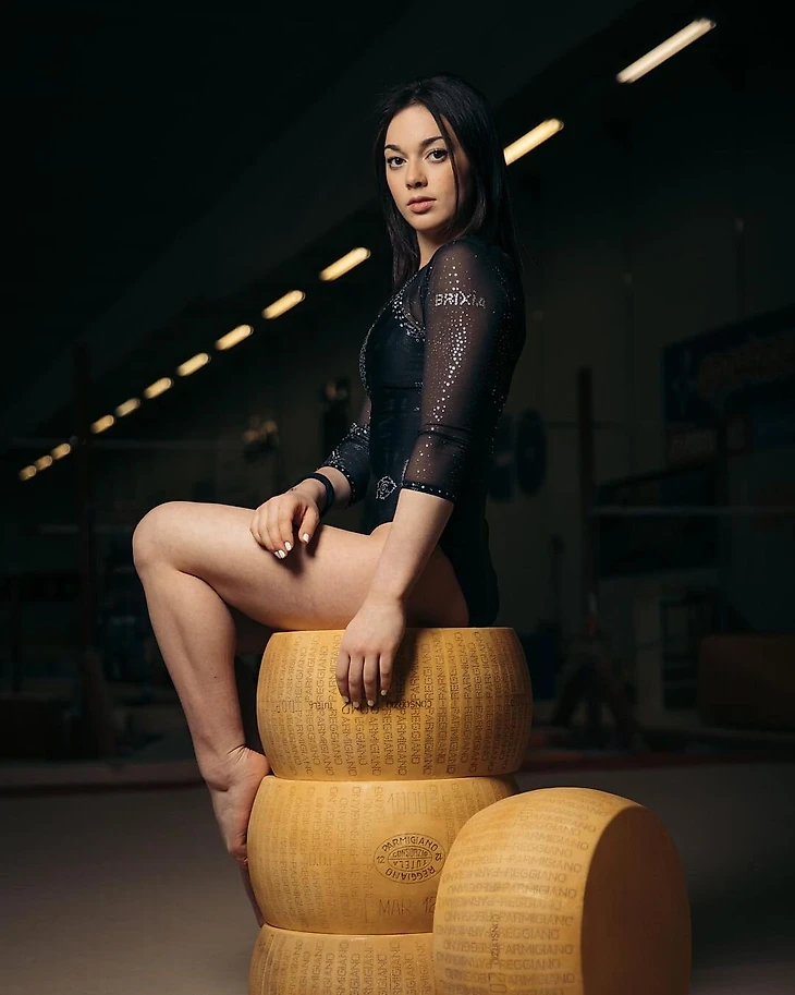 Сразу после исторической медали итальянок в командном многоборье (их первая награда с 1928-го) разошлись фотографии Джорджии, сделанные для рекламы пармезана. Гимнастка и сыр – необычное сочетание, но кадры получилось стильными.