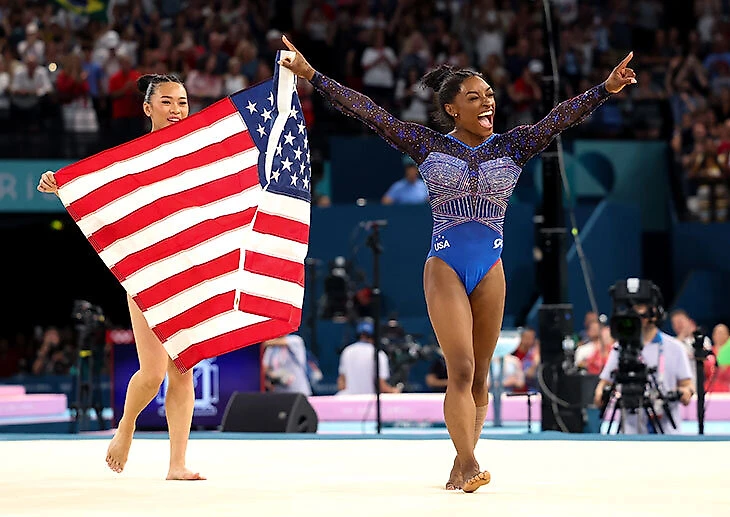 Историческую медаль в личном многоборье (никто до этого не выигрывал вид с перерывом в 8 лет) Байлс взяла в синем купальнике, в котором снова использовали отсылку к флагу, украсив его звездами. На нем тоже около 10 тысяч кристаллов Swarovski.