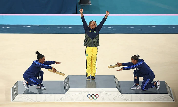 Лучший кадр гимнастического турнира в Париже-2024 – поклон от Байлс и ее подруги Джордан Чайлз в честь чемпионки на вольных Ребеки Андраде.