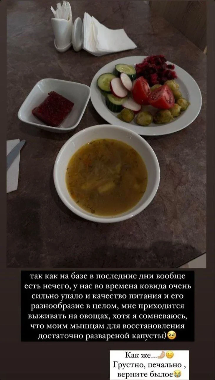 «Мне приходится выживать на овощах, хотя я сомневаюсь, что моим мышцам для восстановления достаточно разваренной капусты. Как же грустно, печально, верните былое. И четвертинка грейпфрута в дополнение. Выглядит, конечно, все это более чем забавно. Но вот так. Как есть», – написала олимпийская чемпионка в соцсети.
