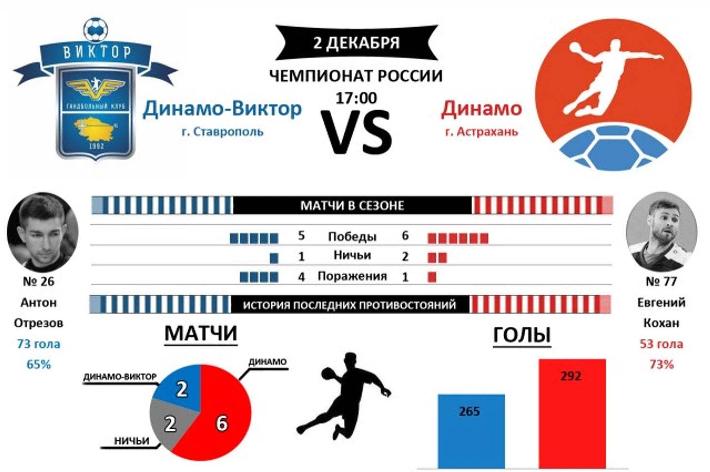 Вывеска "Динамо-Виктор" - "Динамо" Астрахань" всегда привлекает любителей гандбола. Эти матчи носят характер принципиальных и получаются невероятно зрелищными. В последних пятнадцати очных противостояниях ставропольцы одержали победу лишь в трех, однако, два матча закончились вничью, три игры с разницей всего в один мяч и ещё три игры с разницей в два мяча. В последней встрече между командами на товарищеском турнире летом победу одержали викторианцы, также им принадлежит победа и в последнем официальном дерби. Та сумасшедшая игра надолго осталась в памяти болельщиков.