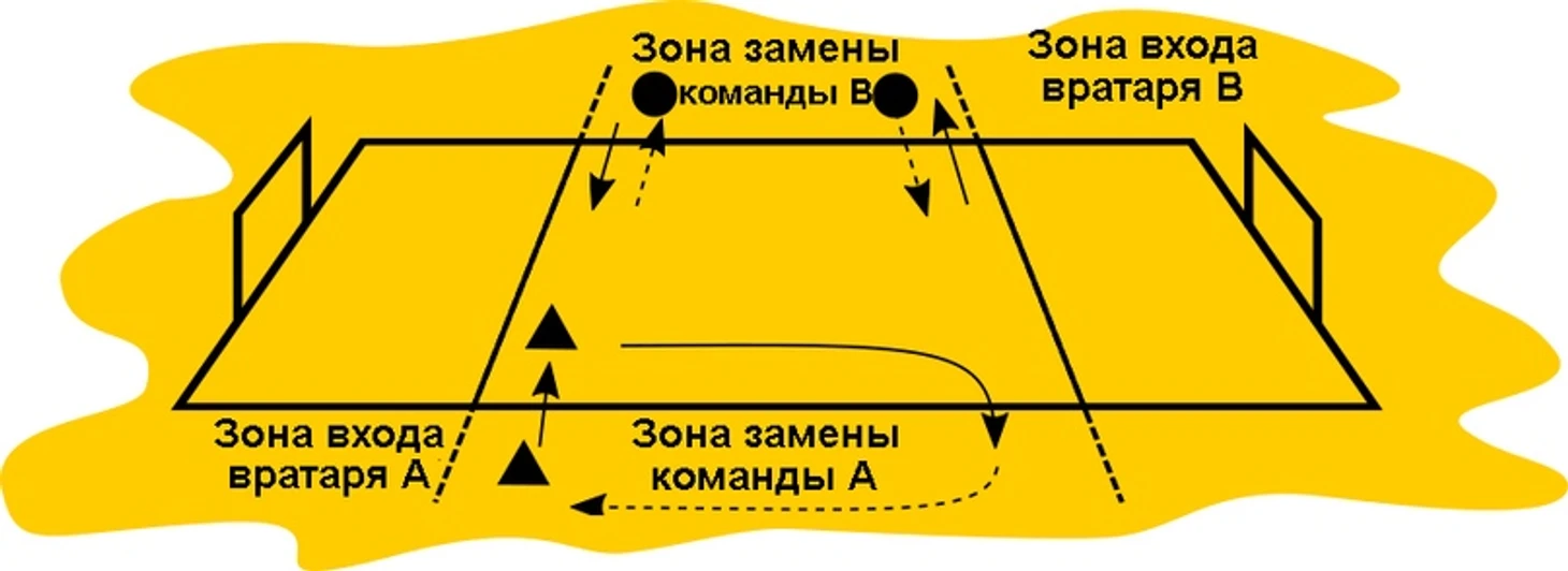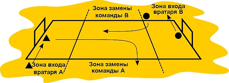 Следует обратить внимание на замену вратаря и играющего в нападении "джокера": войти в игру эти игроки могут только через боковую линию собственной площади ворот, тогда как покинуть площадку им разрешается в любом месте своей зоны замены или через боковую линию своей площади ворот.