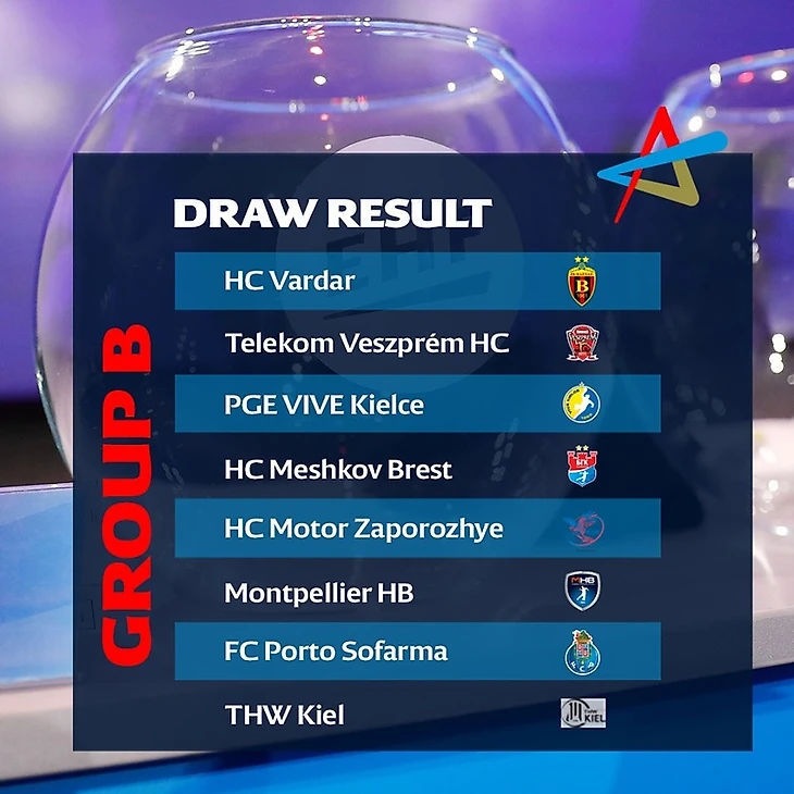 Группа "В": Вардар (Северная Македония), Веспрем (Венгрия), Виве (Польша), БГК им. Мешкова (Беларусь), Мотор (Украина), Монпелье (Франция), Порту (Португалия), Киль (Германия).