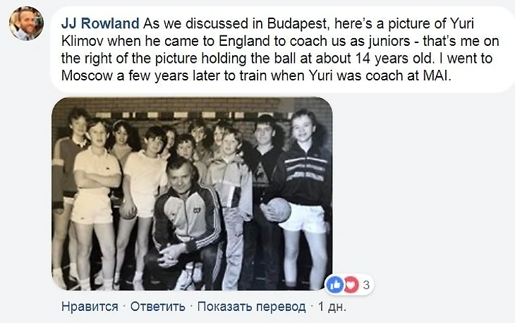 "Это то, что мы обсуждали в Будапеште. Вот картинка с Юрием Климовым, когда он приезжал в Англию тренировать нас еще юношами — это я справа держу мяч, мне около 14 лет. Я потом приезжал в Москву несколько лет спустя — тренироваться, когда Юрий был коучем МАИ".