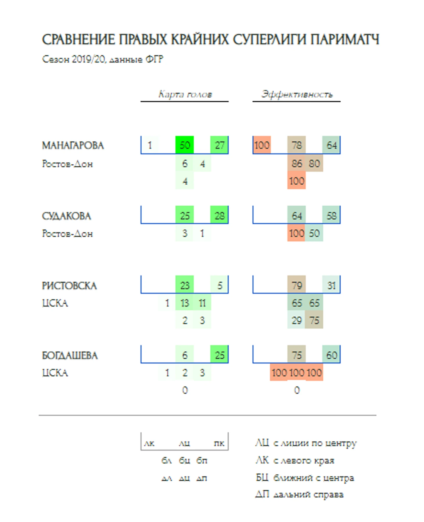 При этом у северомакедонки очень необычная карта бросков. Более половины голов Ристовска забивает не с краю и не с линии, а с ближней и дальней дистанции. С угла она бросает мало и неточно. Такого распределения бросков нет ни у крайних ЦСКА, ни вообще в чемпионате.