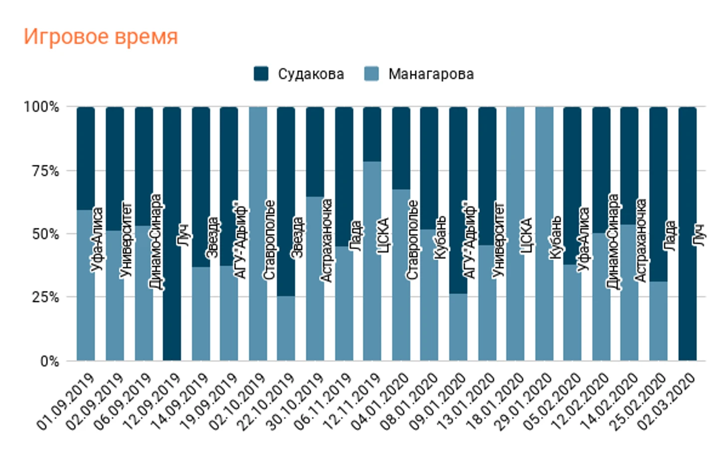 Формально, в чемпионате России Судакова провела на площадке даже больше времени, чем Манагарова (657 и 561 минут, соответственно). Но если учитывать только команды из топ-6, Манагарова отыграла на 70 минут больше. Яркая иллюстрация: если Судакова бегала 60 минут без замен против “Луча”, то Манагарова - против ЦСКА.