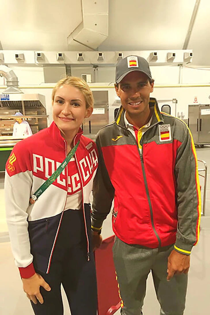 Бедный Надаль с этим подносиком – только подойдет к еде, его окружают другие спортсмены, в основном азиаты. Ему просто покоя не давали! Мы стояли, выжидали, уже думали: может, не надо мучать. Но дождались, подошли – он со всеми сфоткался – такой улыбчивый, позитивный, абсолютно не жаловался и не раздражался. Минут через 30 спокойно ел.