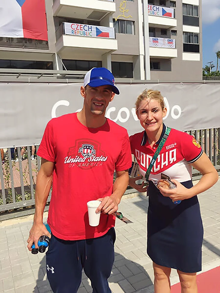 И еще у меня есть фото с Фелпсом. Мой муж – пловец, чемпион Италии. Я решила: увижу Фелпса – обязана с ним сфоткаться. Он бежал на тренировку, но я его отловила.