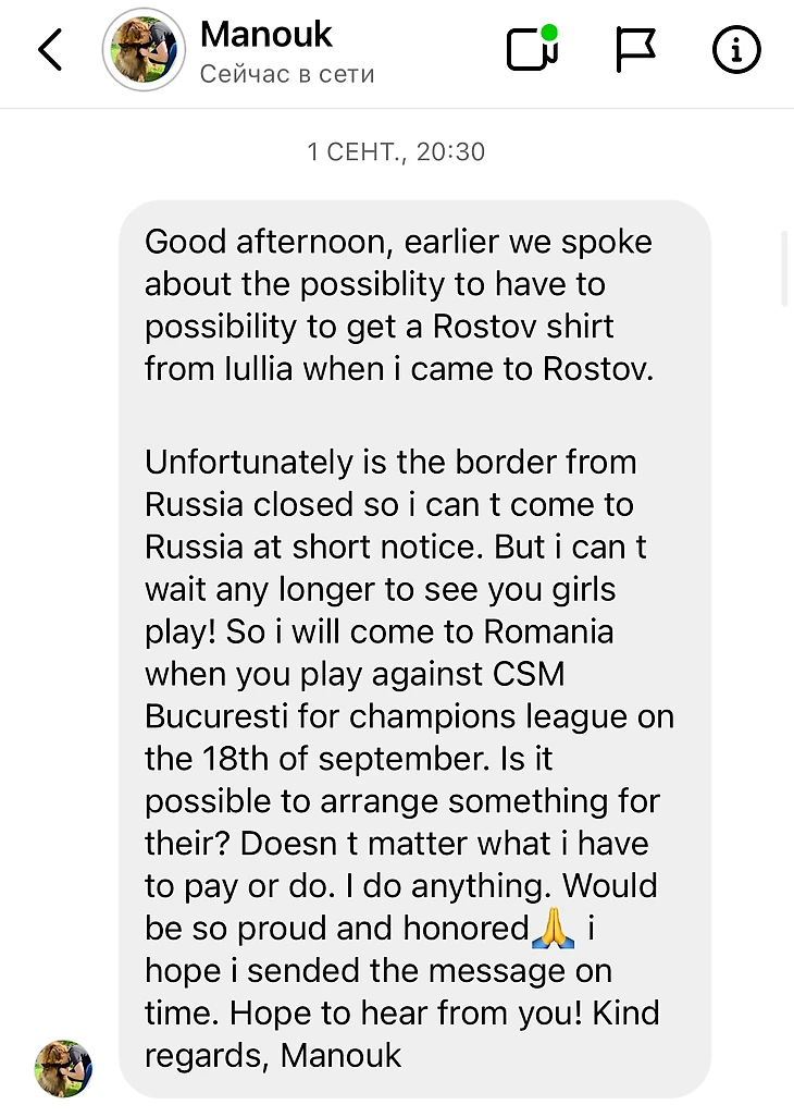1 сентября этого года в директ Instagram нашего клуба пришло сообщения от болельщицы из Нидерландов. Манук Вестерхоф сообщила, что приедет в Румынию на матч «Ростов-Дона» против «Бухареста» в рамках Лиги чемпионов 21/22. Кроме этого, девушка попросила нас помочь исполнить ее маленькую мечту — получить на память игровую футболку любимой гандболистки Юлии Манагаровой.