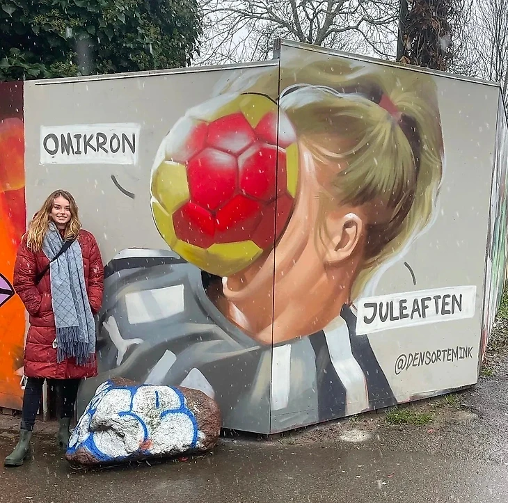 Вратарь сборной Дании Алтея Рейнхардт возле знаменитого граффити в Копенгагене