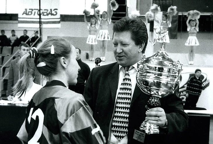 Вратарь Светлана Шаламова получает приз из рук тогдашнего председателя городского спорткомитета Василия Одинокова, одного из отцов-основателей "Лады"