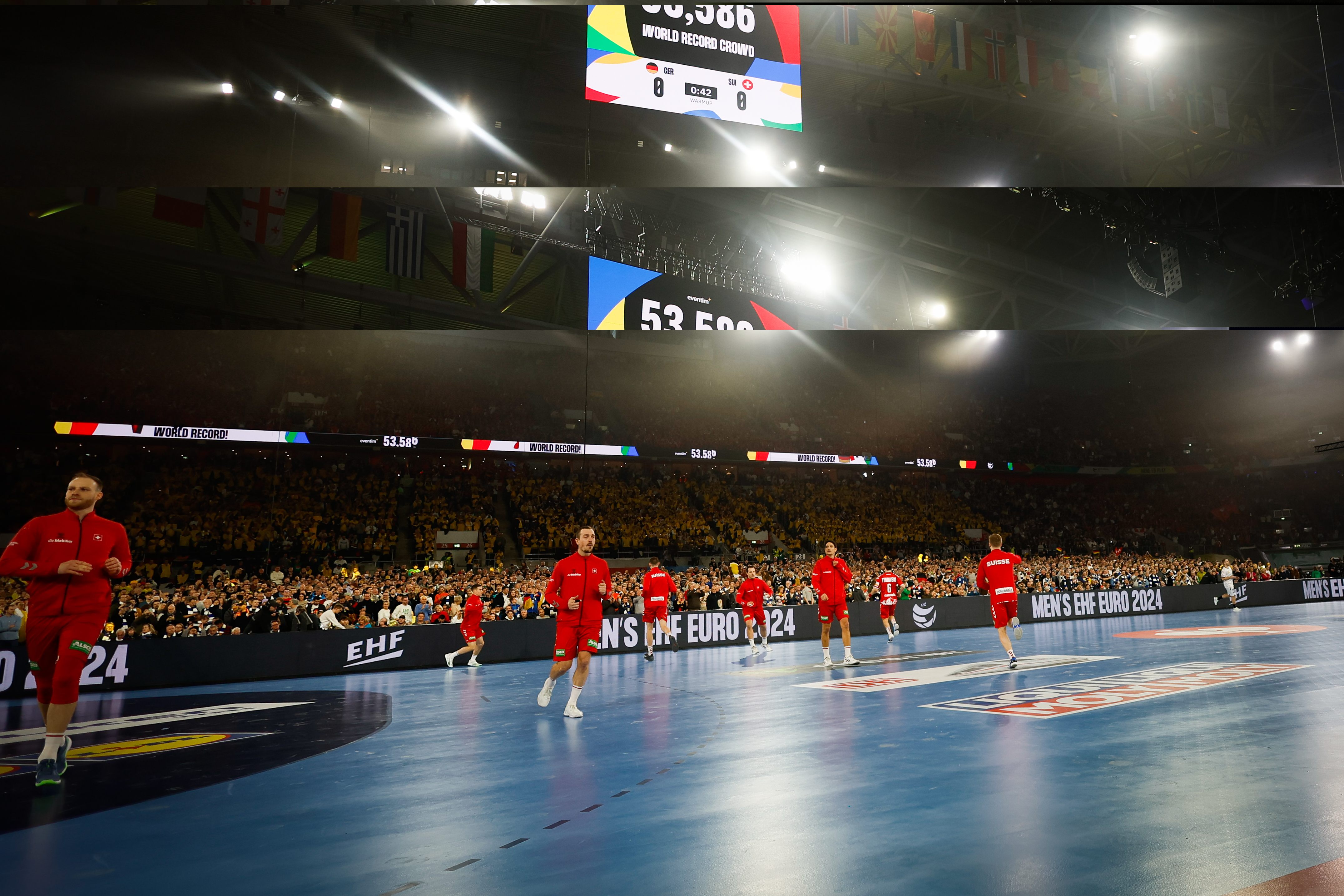 Первый день чемпионата был целиком посвящён грандиозному событию — официальному рекорду посещаемости гандбола. Итоговое число зрителей, пришедших на «Меркур Шпиль-Арену» в Дюссельдорфе зафиксировалось на отметке 53 586, перекрыв прежнее достижение более чем на девять тысяч болельщиков.